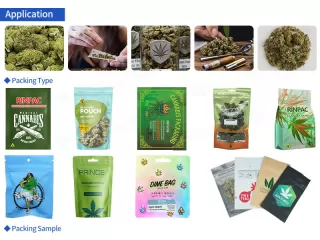 It is suitable for weighing and packing in premade pouch style, such as marijuana, cannabis, beans, nuts, dry fruits, candy, cereal, chocolate, biscuit, peanut, capsule, seeds, chemicals, sugar, etc.