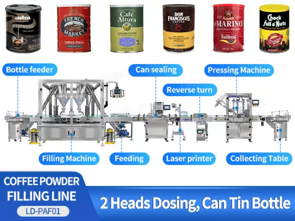This powder filling line is suitable for coffee powder, milk powder, protein powder, health powder, medical powder, nutrition powder, monosodium glutamate, solid beverage, icing sugar, dextrose, feed, solid medicament, powdery additive, etc.