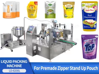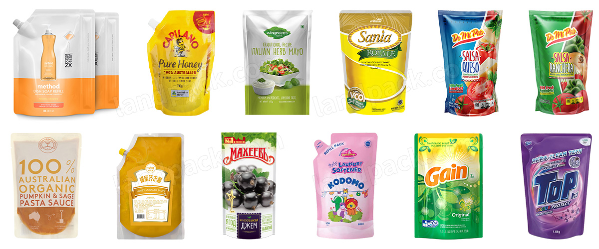 Landpack automatic liquid rotary packing machine premade stand up pouch packing machine, it is suitable for all kinds of liquid packing , such as liqiud detergent, shampoo, sauce, rice vinegar, fruit juice, beverage, tomato sauce, peanut butter, jam, paste, etc.