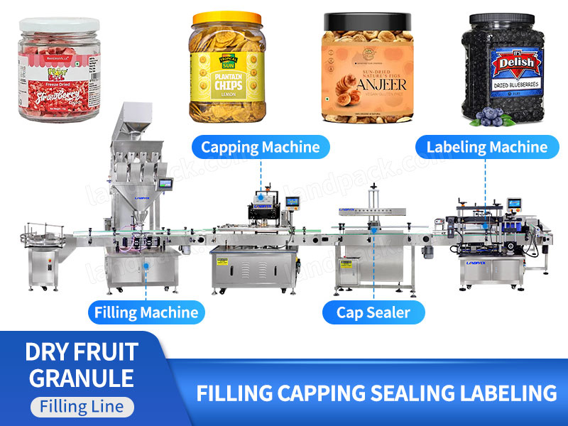 This filling line machine is suitable for the filling of granular materials in food, daily necessities and other industries, such as dried fruit, candy, tea leaf, chocolate beans, nuts, peanuts, oatmeal, beans, puffed food, fish feed, beef jerky, etc.