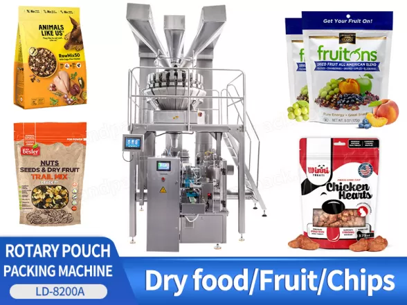 Suitable for automatic packing of grain and solid food, such as dry food, dry fruit, dry tomatoes, dry mango, nuts, popcorn, coffee beans, nut, cashew, beef jerky, dry food, candy, chocolate, raisins, etc. Different kinds of products with stand-up pouches, doypack with zippers, 3-side seal bags, 4-side seal bags, flat bags, etc.