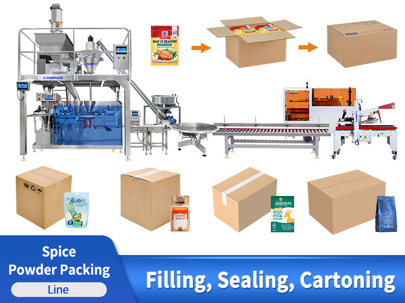 Equipped with a screw feeder, vacuum feeding system, powder filling machine, 4-head linear weigher, check weigher, rotary arranging table, carton erector, and carton sealer, it delivers efficient end of line packaging solutions for pouch packing operations.