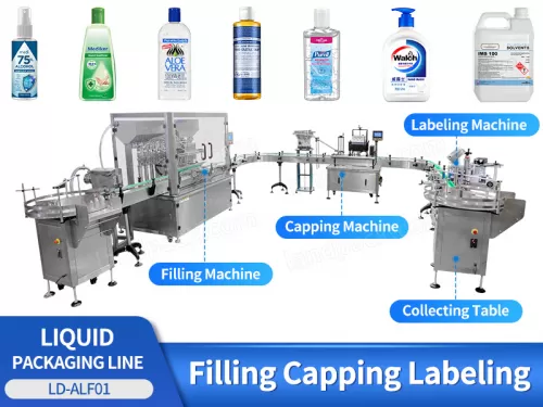 This filling line is suitable for automatic filling, capping and labeling of various liquid products. Round, flat, square and other shaped bottles, cans, boxes and jas.