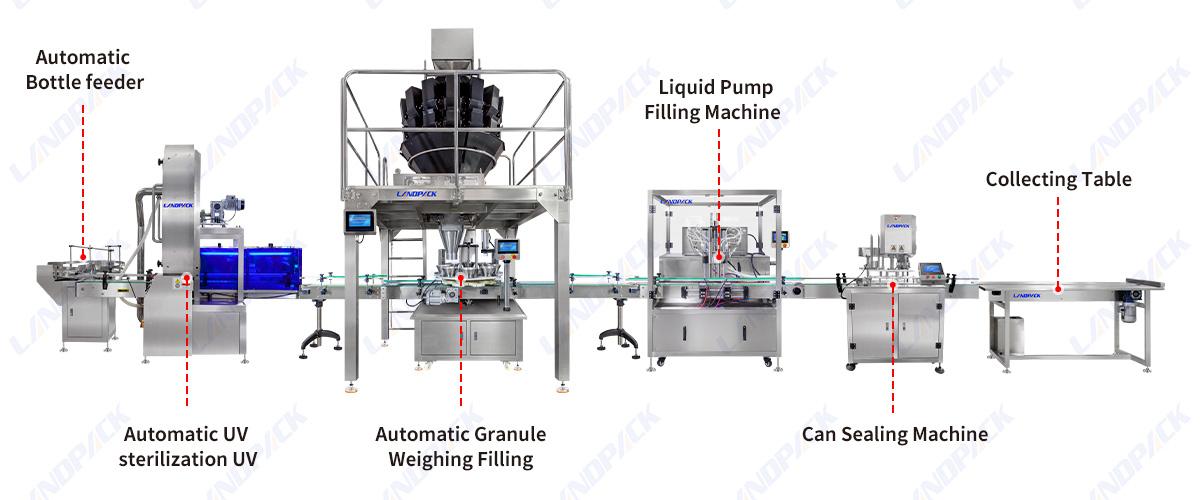 This granule liquid mixing filling machine line is suitable for filling granular and liquid materials such as fruit, marinade pickled products, pickles, sweet potato, mango pulp, nuts, corn flakes, peanuts, melon seeds, pepper, pepper, etc..