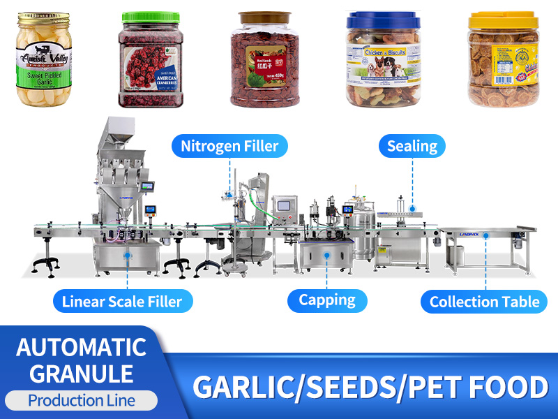 It is suitable for filling all kinds of granule material, sheet material, strip material, and abnormity material, such as nuts, candy, melon seeds, chips, peanuts, nutlets, preserved fruit, jelly, biscuit, confect, camphor ball, currant, almond, chocolate, filbert, corn, etc.