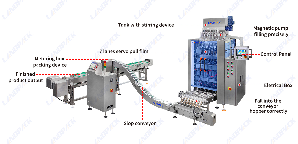 Automatic multi track juice stick packing machine with counting cartoning machine is designed for liquid products, such as juice, shampoo, shower gel, fruit juice, syrup, mayonnaise, honey, milk, mouthwash, sauce, jam, jelly, etc.
