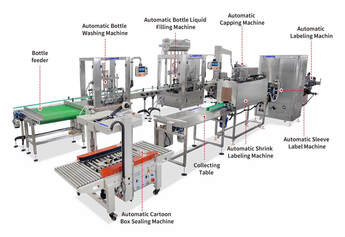 This bottle liquid filling line can be customized to fill various liquid products such as peanut butter, alcohol, liquor, hand sanitizer, mouthwash, oil, liquid detergent, shampoo, sauce, paste, honey, tomato sauce, salad sauce, etc.