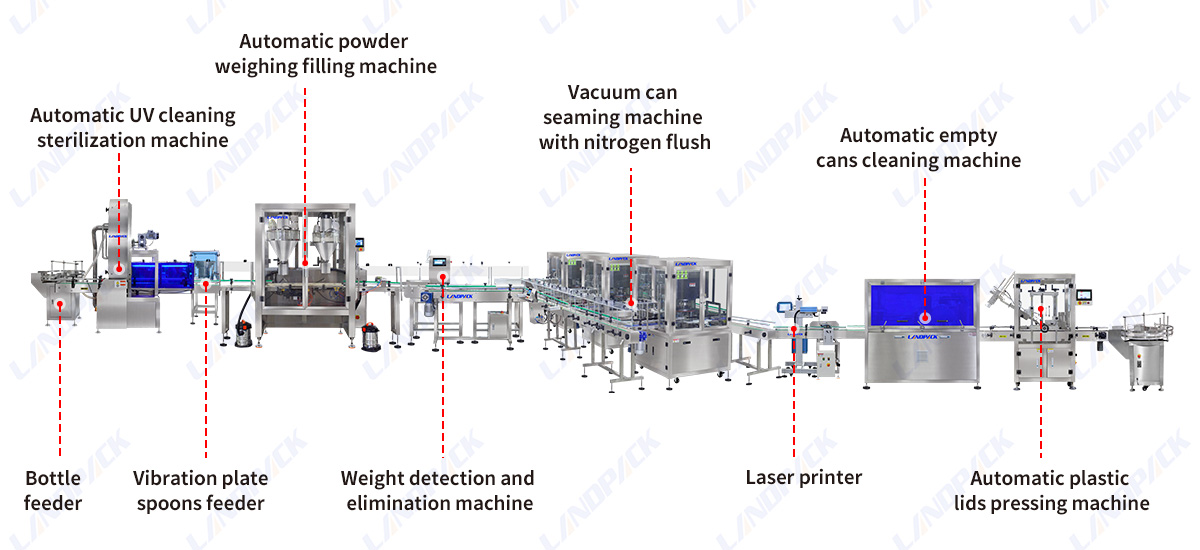 Automatic milk powder filling line with uv sterilizer/ vacuum nitrogen sealing, equipped with three vacuum nitrogen sealing, weight detection and ultraviolet sterilizers. It is suitable for automatic filling of various powder products, such as milk powder, coffee powder, spice powder, protein powder, nutritional powder, medicine powder, meal replacement powder, etc.