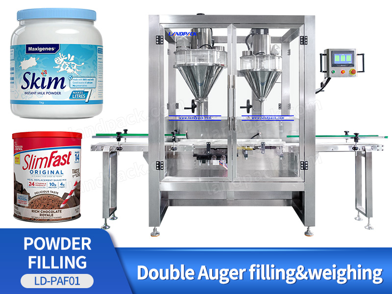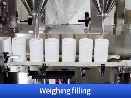 This double heads powder filling machine is suitable for bottling all kinds of fine powder materials, such as flour, sugar, salt, coffee powder, peanut powder and so on.