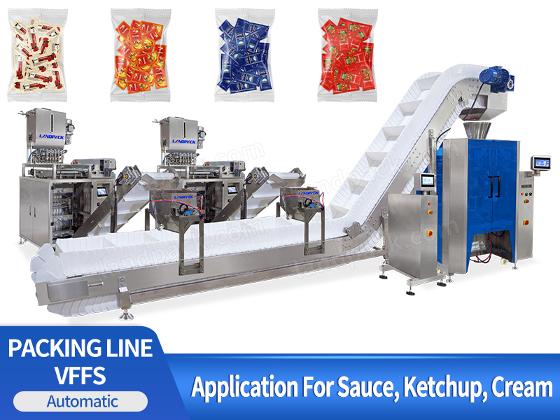 Automatic multilane liquid sachet counting into bag packaging line is suitable for packing kinds of liquid products, such as sauce, shampoo, shower gel, fruit juice, honey, milk, mouthwash, jam, jelly, etc.